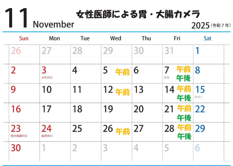令和7年11月9日(日)は内視鏡検査日です。週末の検査枠は非常に人気が高く予約が取りにくくなっております。平日に胃カメラ、大腸カメラを行うことが難しい方は是非日曜日の検査をご検討ください。