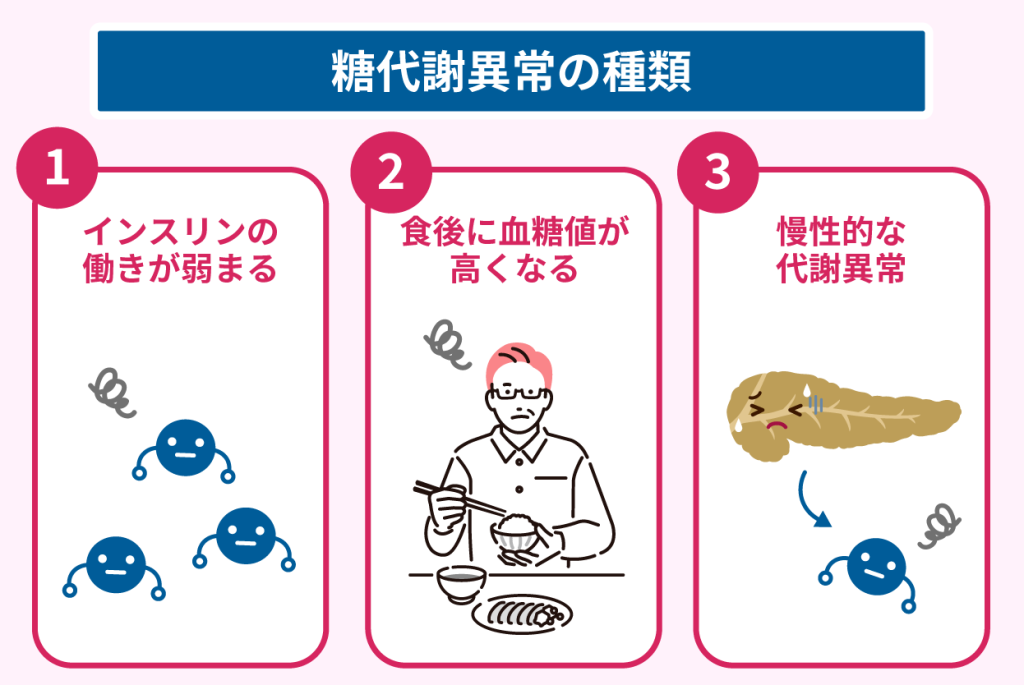 糖代謝異常は主に3種類に分けられ、それぞれ異なった特徴があります。