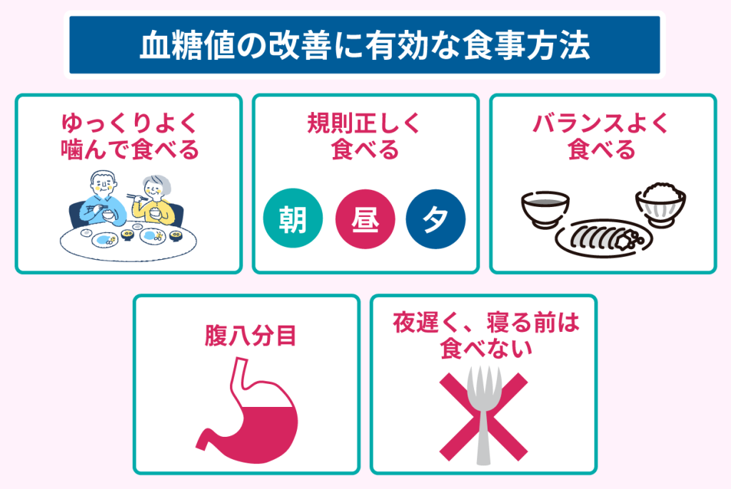 ゆっくりとよく噛んで食べると消化吸収が緩やかになり、血糖値の急上昇を防げます。