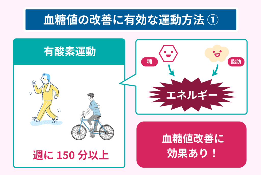 有酸素運動中は、体内の糖質と脂肪をエネルギーとして使用するため、血糖値の改善に効果があります。