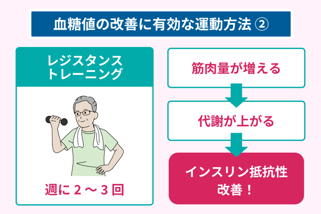 血糖値の改善に有効とされている運動方法は、有酸素運動とレジスタンストレーニングの2種類あります。