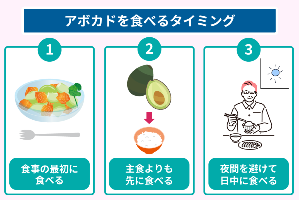 アボカドは夜間を避けて、日中の食事の最初や主食の前に食べると健康効果を最大限に引き出せます。