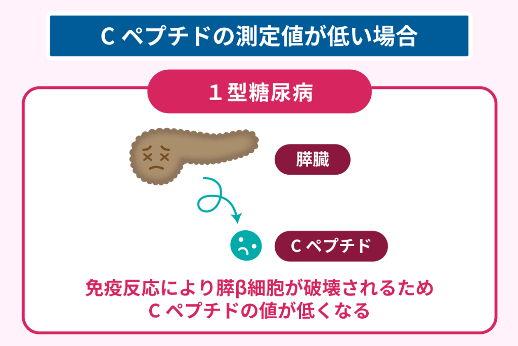 1型糖尿病は、膵臓の分泌機能の低下によって著しいインスリンの分泌低下が見られるため、Cペプチドの値も著しく低値を示します。