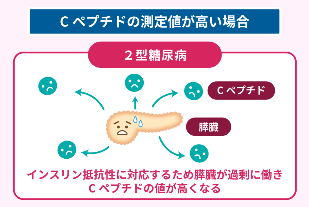 一方、2型糖尿病の初期ではインスリン抵抗性に対応するため膵臓が過剰に働き、Cペプチド値が高い傾向があります。