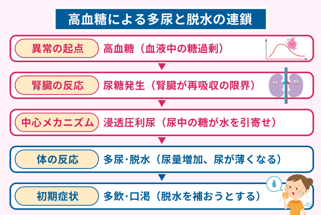ではなぜ高血糖状態が多尿を招くのか、その仕組みを次の内容で解説します。