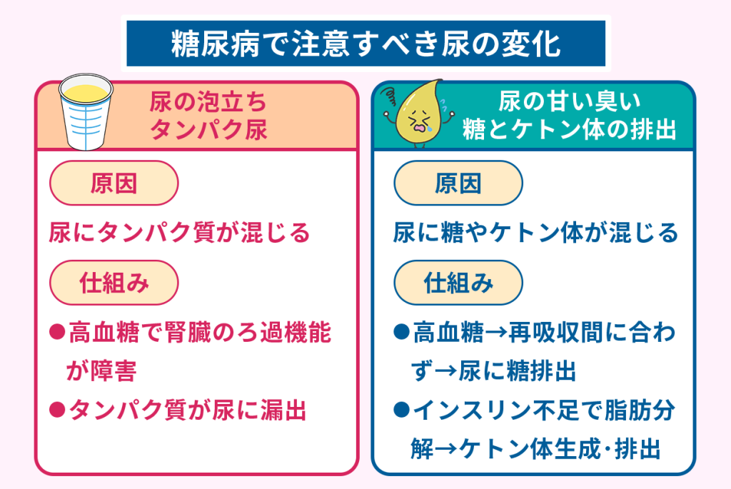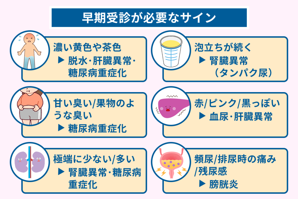 • 尿の色や量の変化は、糖尿病の可能性を示唆するサインである