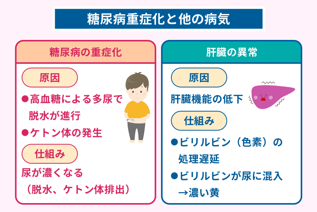 しかし、糖尿病の重症化や肝臓の異常では、以下の仕組みで尿の色が濃くなります。