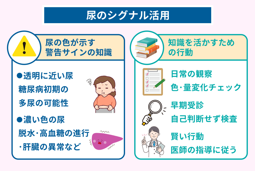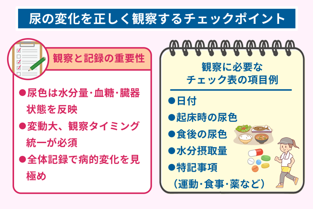 • 尿の色を健康管理の指標として活用するためには、起床時や食後といったタイミングを決めて観察したり、水分摂取量との関連を記録したりすると良い