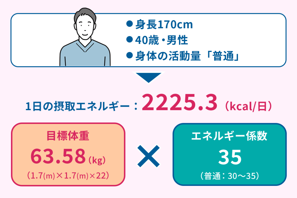 エネルギー係数を35とすると、1日に必要なエネルギー摂取量は以下の計算になります。