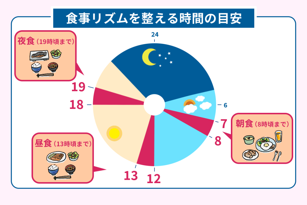 3食の間隔を均等にするために朝食は8時頃までに、夕食は19時頃までを目安に取りましょう。