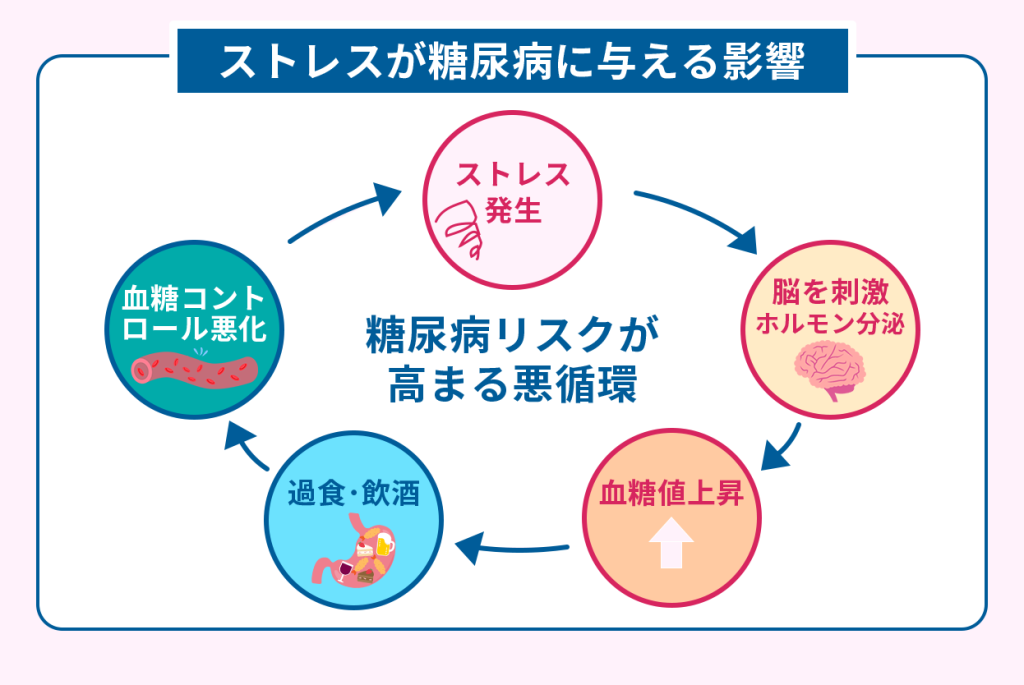 ストレスは脳を刺激して、血糖値を上昇させるホルモンの分泌を促進するため、糖尿病を招く重要な原因のひとつです。