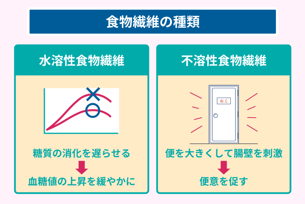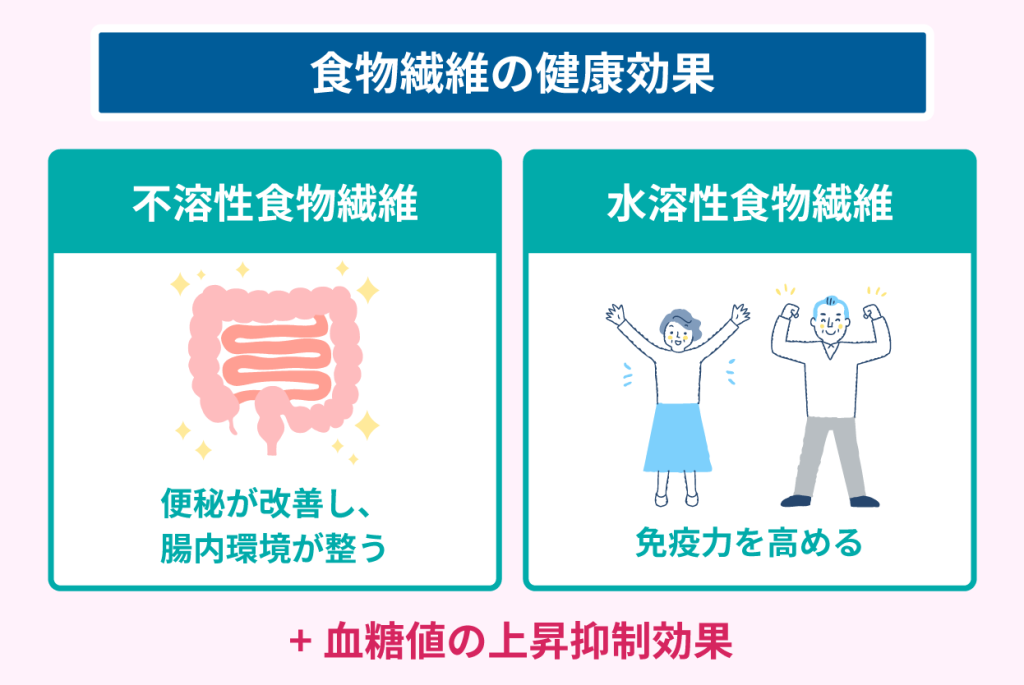 - 水溶性食物繊維:体内で水分を吸収して粘着質になり、糖質の消化を遅らせて、血糖値の上昇を緩やかにする