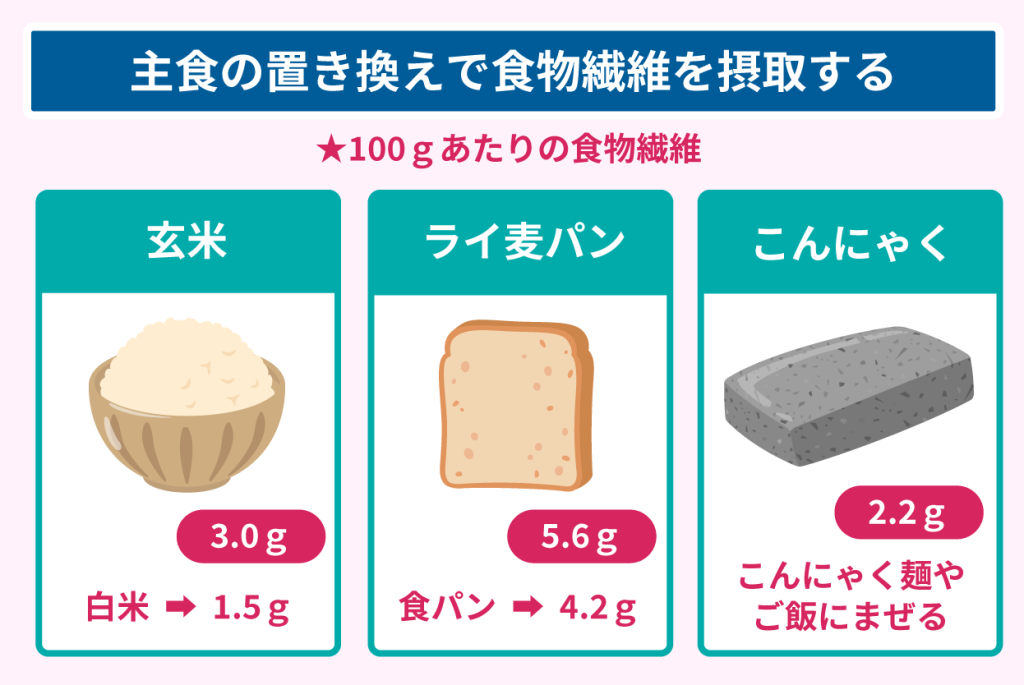 玄米やこんにゃく麺の置き換えで主食からも食物繊維を摂取する