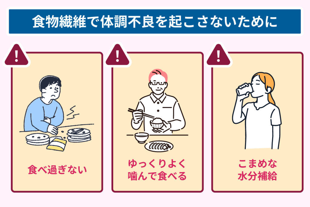 食物繊維で体調不良を起こさないために、以下の工夫についても実践しましょう。