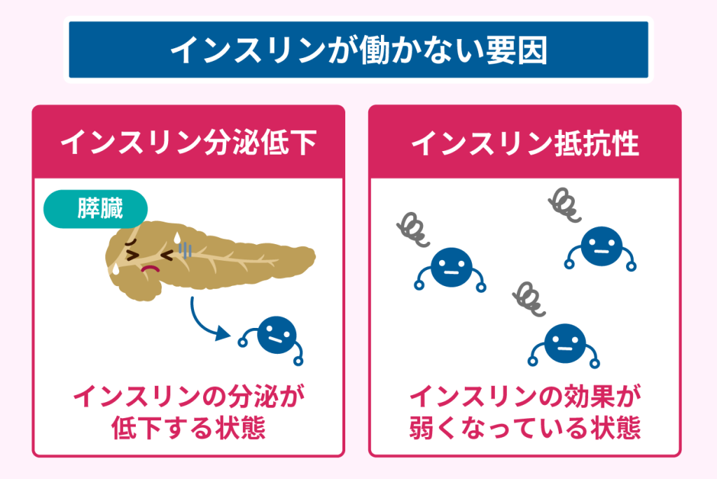 インスリンが働かない要因は、インスリン分泌低下とインスリン抵抗性の2種類があります。