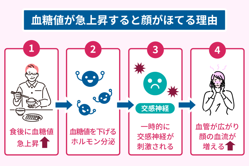 血糖値が急上昇するとなぜ顔のほてりが出現するのか、その仕組みを以下にまとめました。