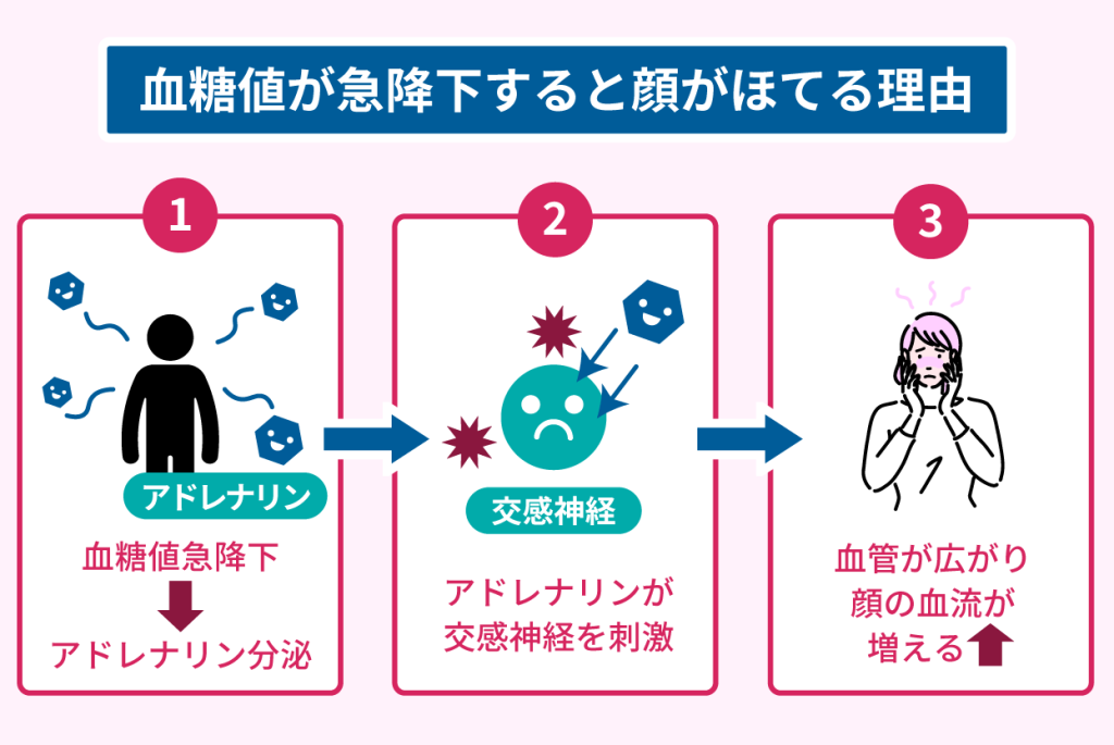 血糖値が急降下する反応性低血糖でも、以下の流れで顔のほてりが出現します。