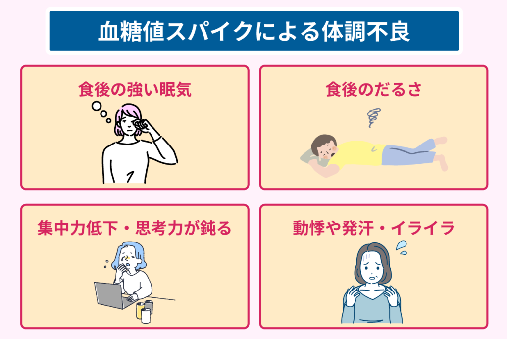 - 血糖値スパイクは食後の強い眠気やだるさ、集中力の低下を引き起こす