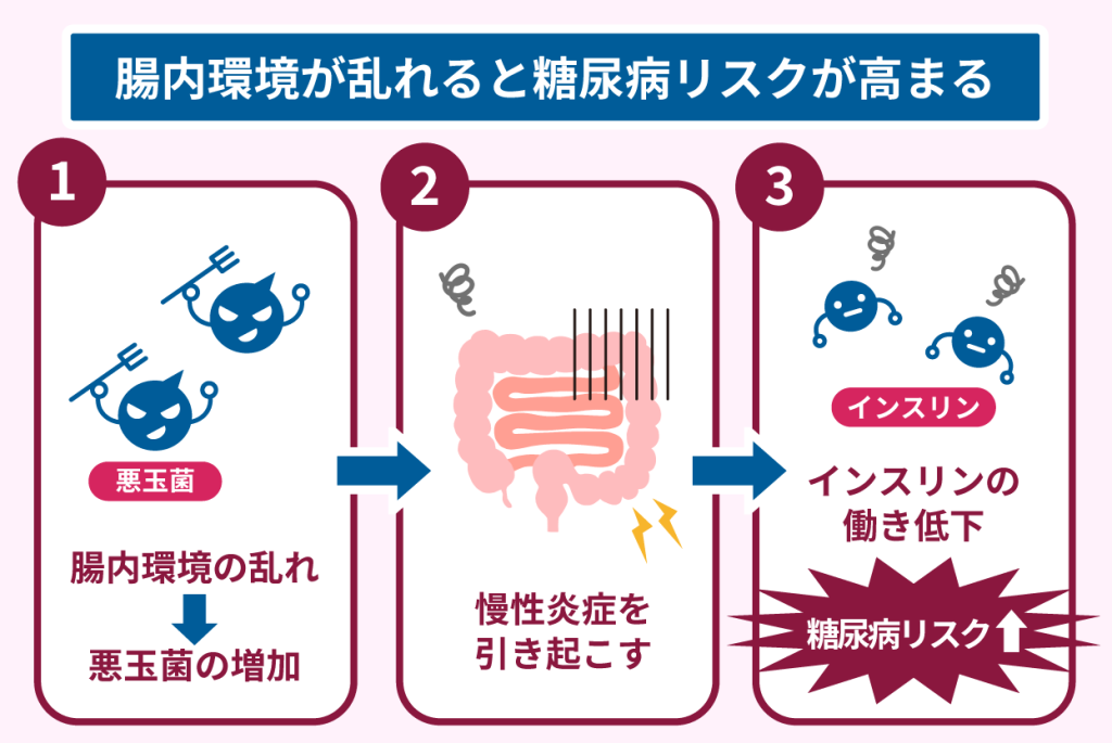 腸内環境の乱れによってインスリン抵抗性が悪化すると、糖尿病の発症リスクが高まります。