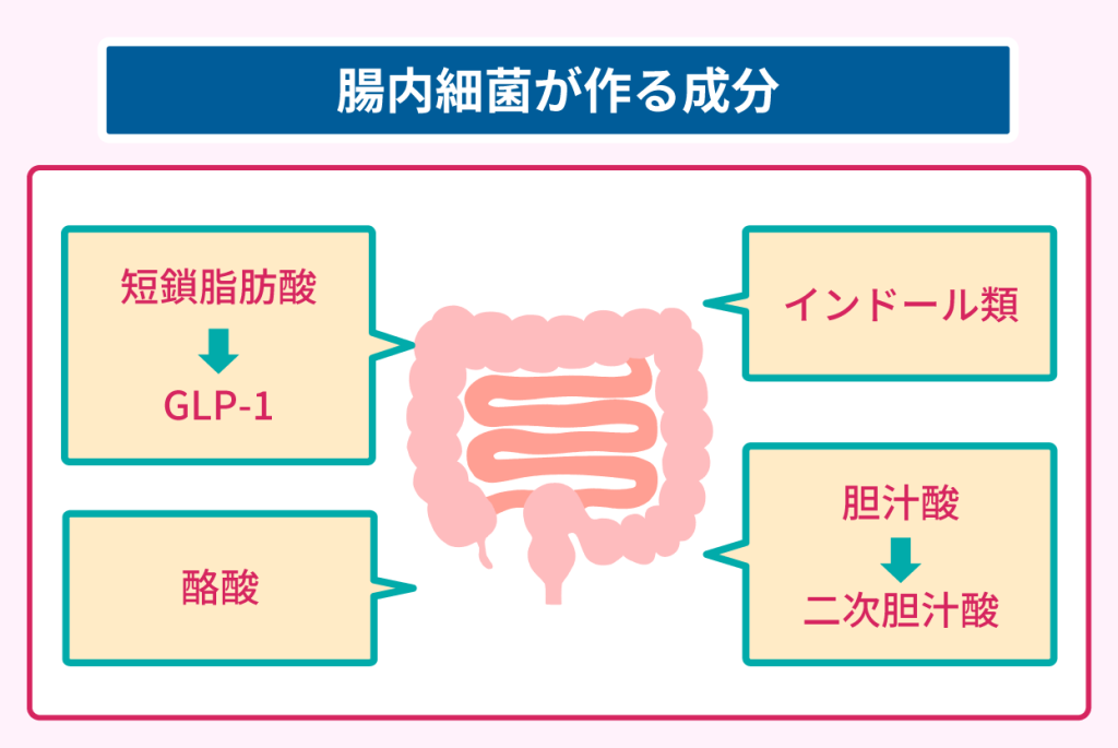 代表的な成分である短鎖脂肪酸は食物繊維を腸内細菌が分解する過程で生まれ、腸の細胞に作用してGLP-1の分泌を促します。