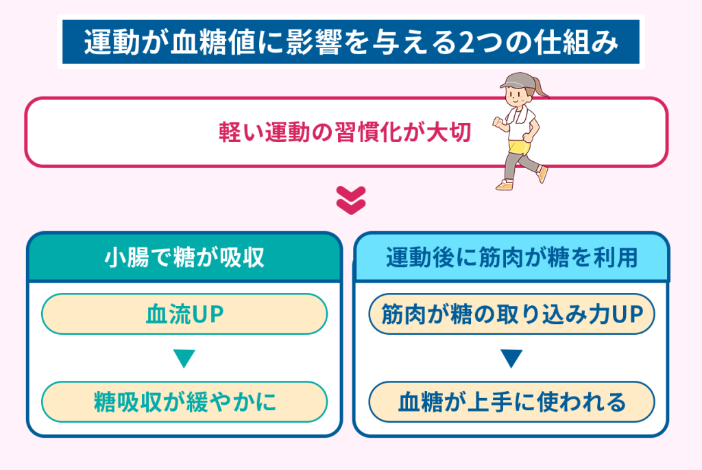 運動が糖吸収や血糖コントロールに影響を与える理由には、以下2つの仕組みがあります。