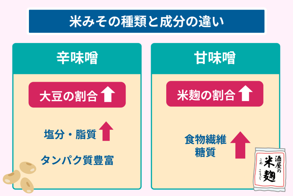一般家庭の味噌としてよく使われているのは米みそであり、大豆と米麴の配合量によって、辛味噌と甘味噌に分けられます。