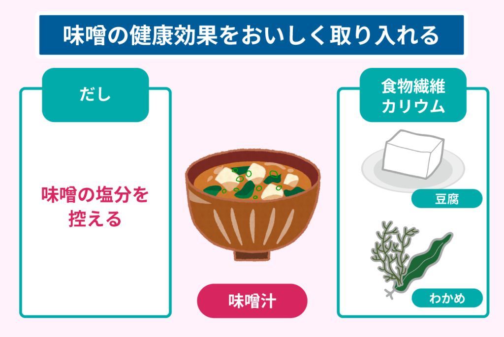 摂取量の範囲内で味噌を使いつつ、塩分過多を防ぎたい場合はだしによる味付けやカリウムの多い食材の摂取が効果的です。