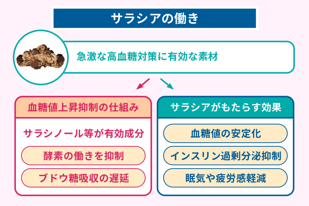 サラシアに含まれるサラシノールという成分が糖の吸収を緩やかにし、インスリンの過剰な分泌を防ぎます。