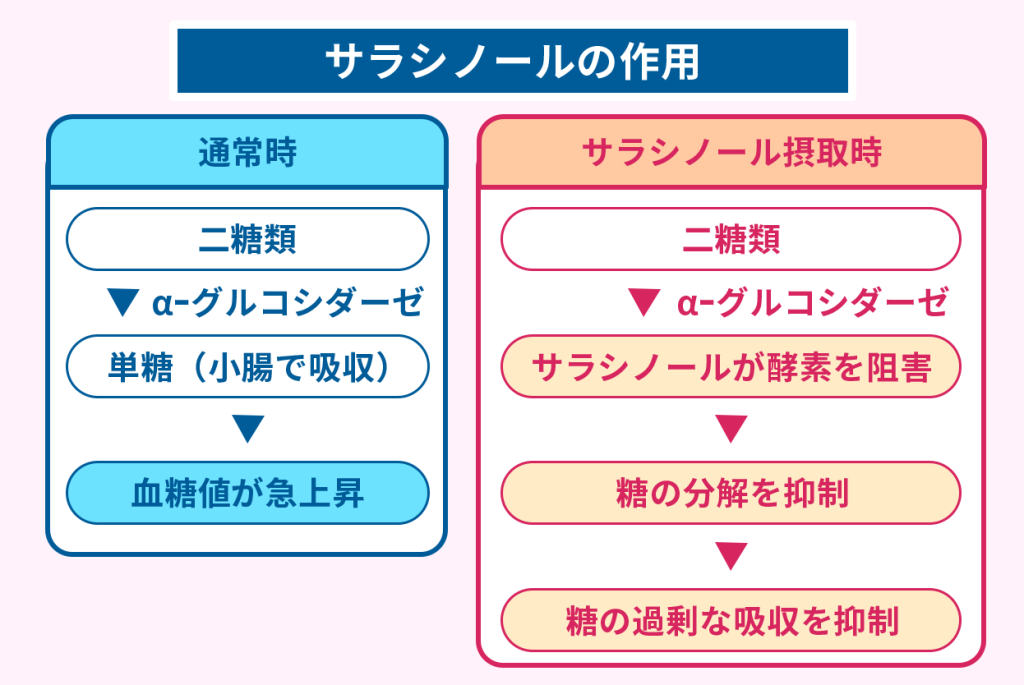 サラシノールは小腸で糖質の吸収を防ぐ働きがある
