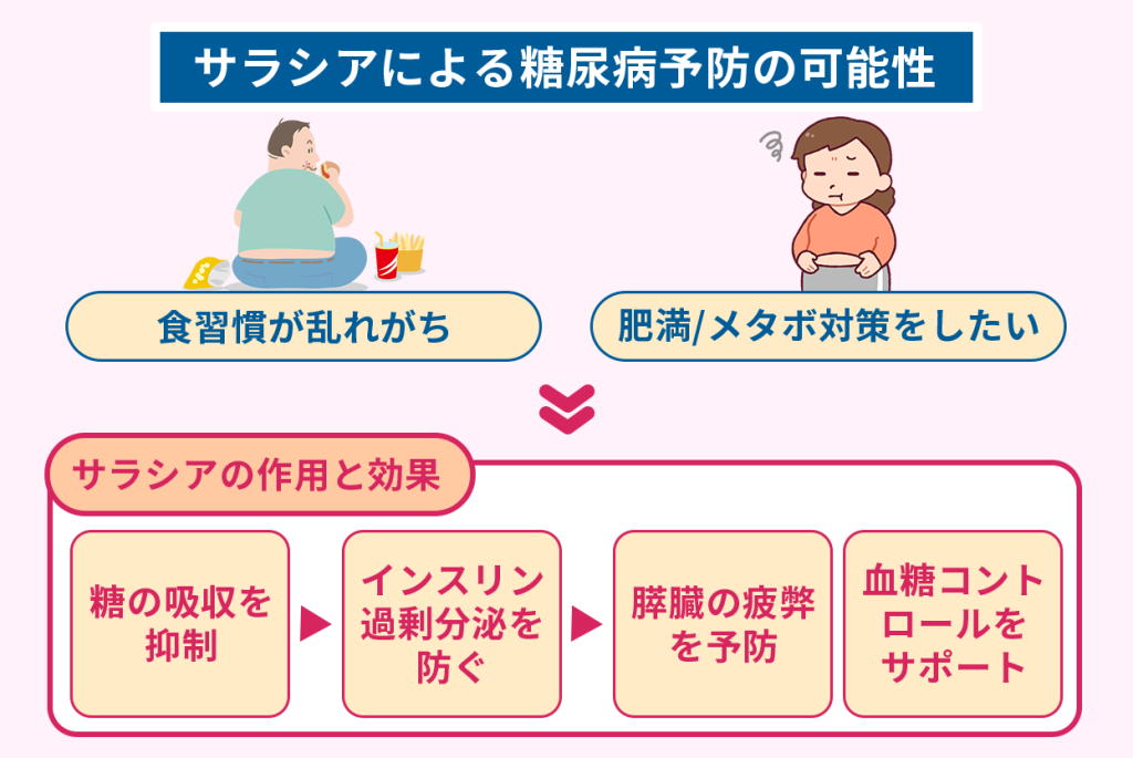 - サラシアによって糖の吸収が緩やかになると糖尿病予防につながる