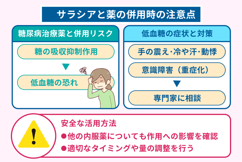 サラシアの有効成分は血糖値を抑える作用を持つため、糖尿病治療薬との併用で血糖が過剰に下がる恐れがあります。