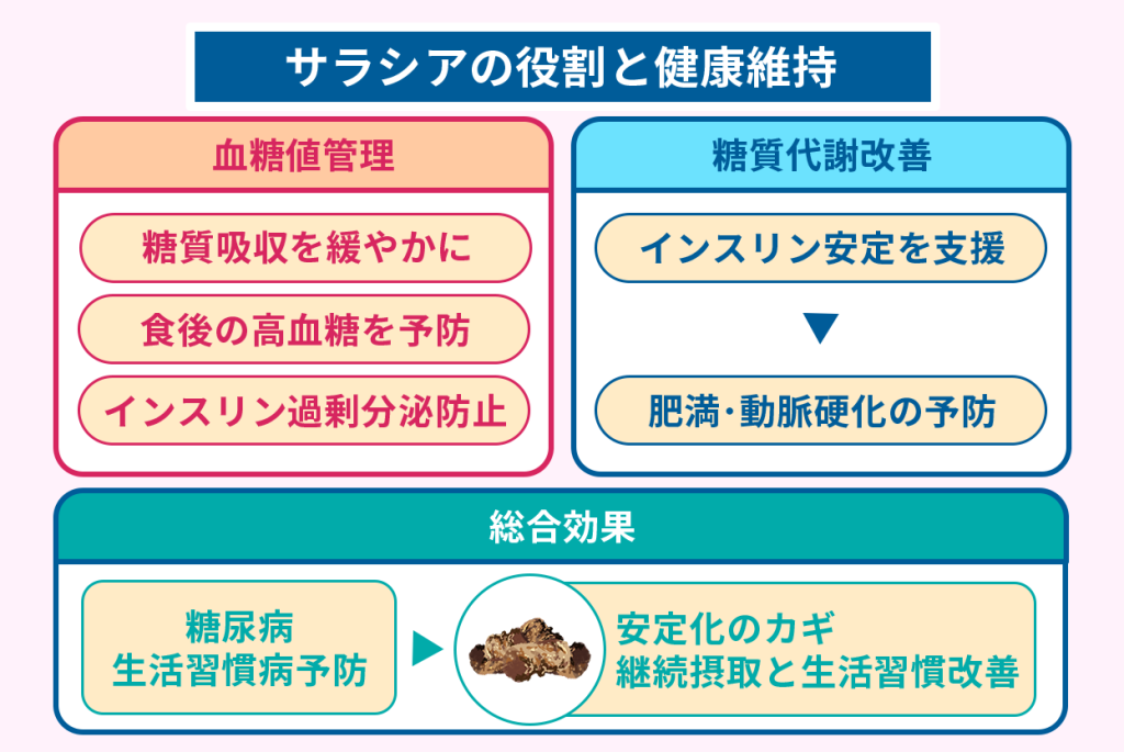 有効成分であるサラシノールは糖質吸収を緩やかにし、食後の高血糖やインスリン過剰分泌を防ぐ働きがあります。