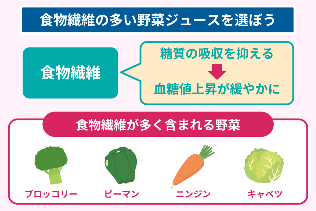 野菜ジュースは野菜よりも食物繊維が少なく、血糖値が大きく上昇する可能性が高い飲料であるため、食物繊維が少しでも豊富なものを選ぶ必要があります。