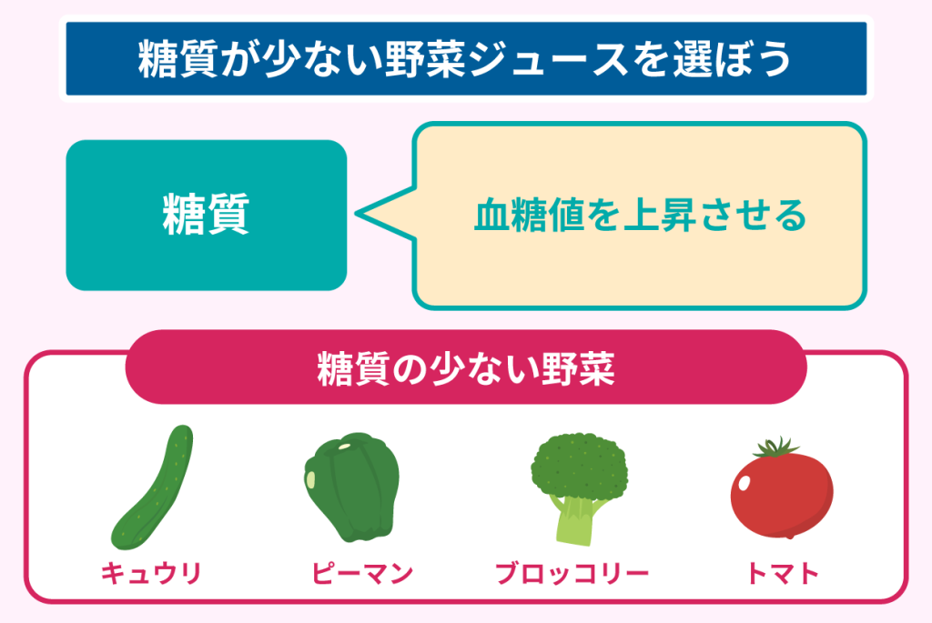 野菜ジュースの中には、無糖や糖質オフなどの野菜のみよりも糖質が少ないものもあり、これらは血糖値が気になる人に向いています。