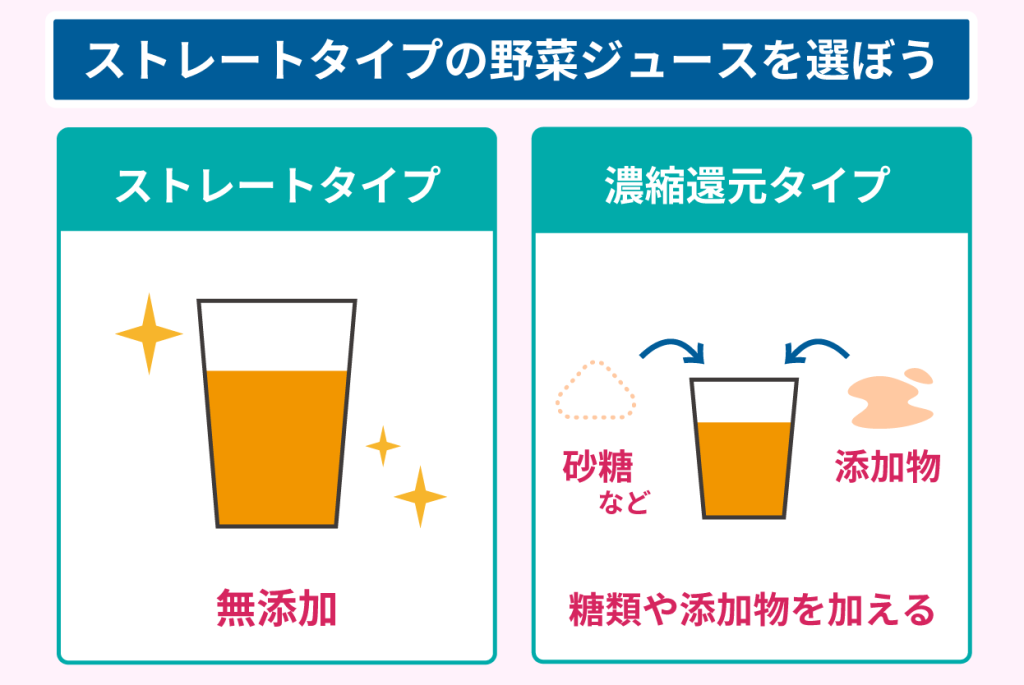 したがって、野菜のしぼり汁100%の野菜ジュースを飲用する場合は、ストレートタイプを選びましょう。