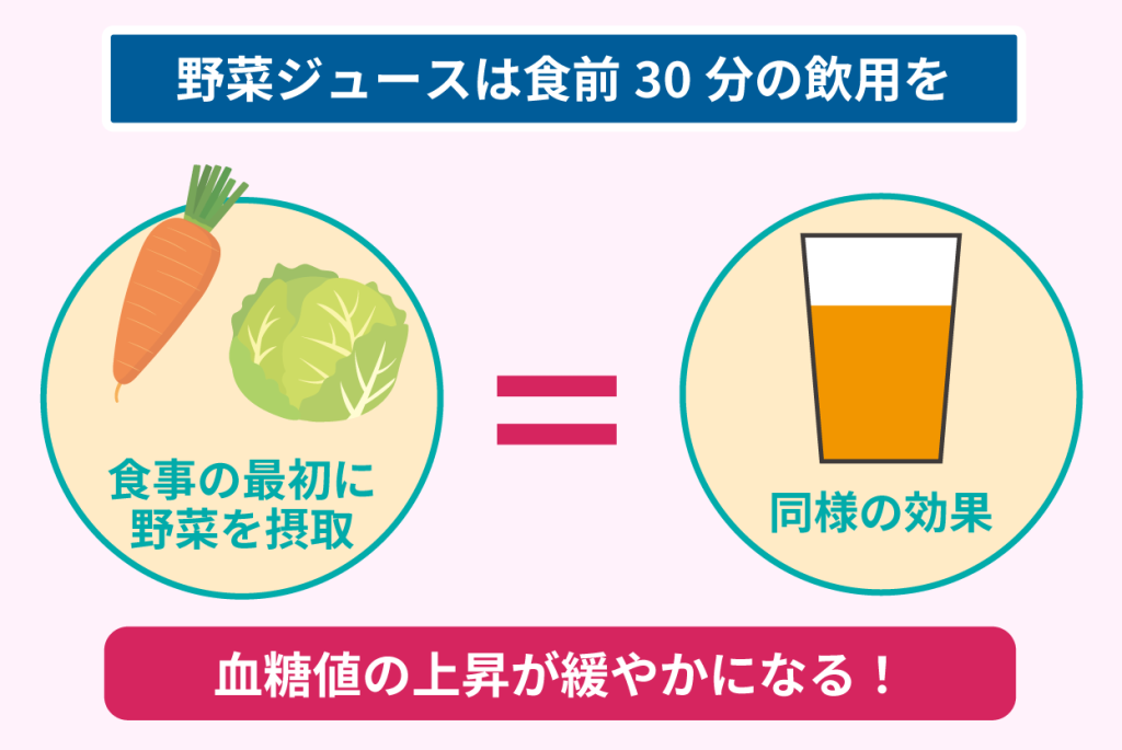 つまり食事の前に血糖値上昇を緩やかにするために、野菜を最初に摂取するベジファーストがありますが、食前30分の野菜ジュースの飲用も同等の効果があるということです。