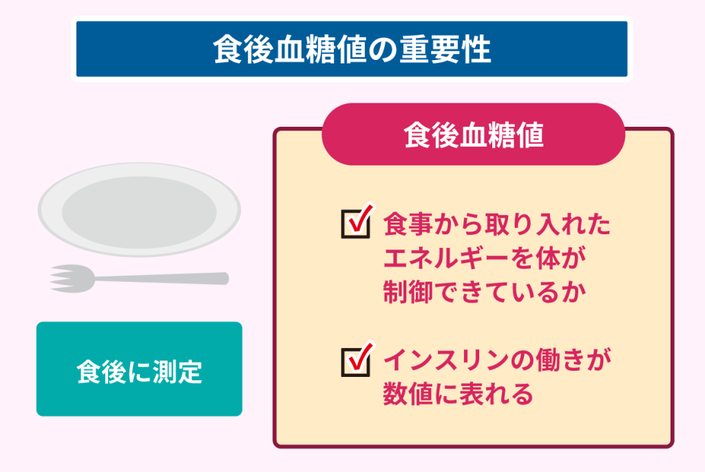 食後血糖値の測定は、食事に対して体がどのように反応しているかを把握するために必要です。